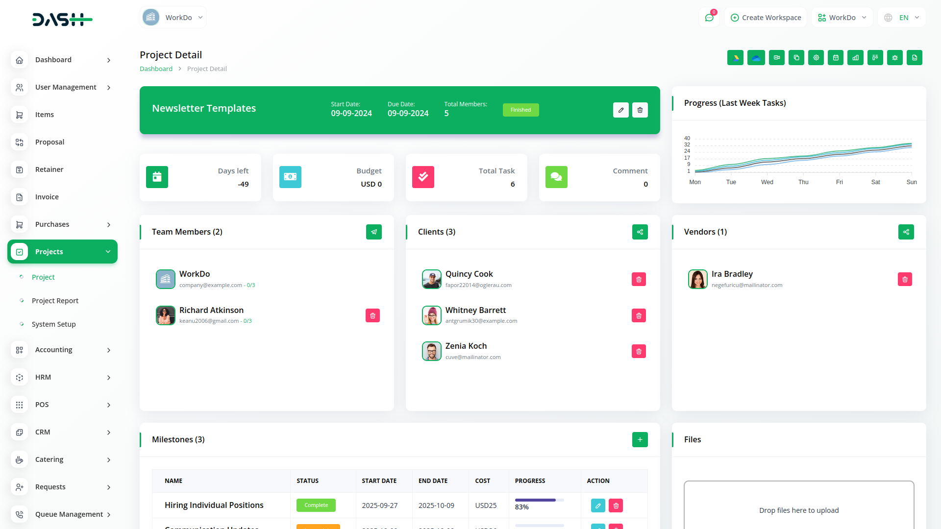 Adjunte el costo y el resumen a los hitos y cambie el estado a través del menú desplegable.